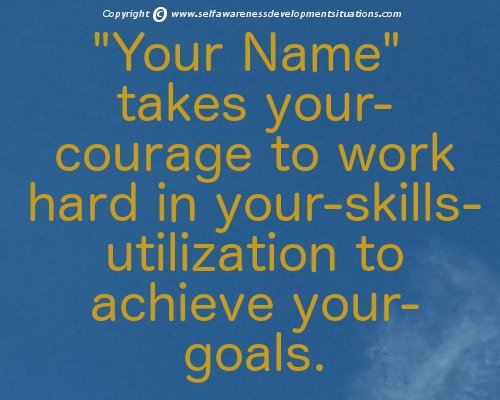 Kindly take note also of the sequence of the words in the sentence.Take Your-courageBy allowing your-courage to reign inside you, you are effectively being possessed in your self-regulation towards whatever you want to do. For example, you want to be effectual in your-skills-utilization or focusing on your-goals. So, in this instance, courage is your first level as you see in the sentence given above (that is "take your-courage..."). You then need, like a seasoned chef, to take your-courage to the next level, which is your skill utilization. You now have courage-skills linked together. Take Your-skills-utilization and Add This to Your-courageWhat product do you get when you mix or combine your-courage with your-skills-utilization inside you as a living soul? While that product is totally your own to experience, you should be able to see that you will have courage to utilise your skills. If you were cooking a home meal, naturally, you would excel. But wait a little! What is your goal for cooking the meal? Remember, you just have the courage-skills combination. Go For Your-goalsSay, as a seasoned chef, your goal is to have your family enjoy a healthy meal. Now you have a motivation for cooking the healthy meal for your family courageously utilising the very best of your skills. In the beginning of this article you saw a similar sentence to this one above - so take your-courage to work hard in your-skills-utilization to reach your-goals. Just as in a well cooked meal you find a combination of ingredients so also in your self-development you find a combination of personal qualities for your diligent awareness to show in situations you find also yourself in. This is practical leadership, the combination of courage-skills-goals. So, to produce a tangible product you need a useful combination of your personal qualities in practice, not theory. Verbalize Your Combination of Your-courage, Your-skills-utilisation, Your-goals