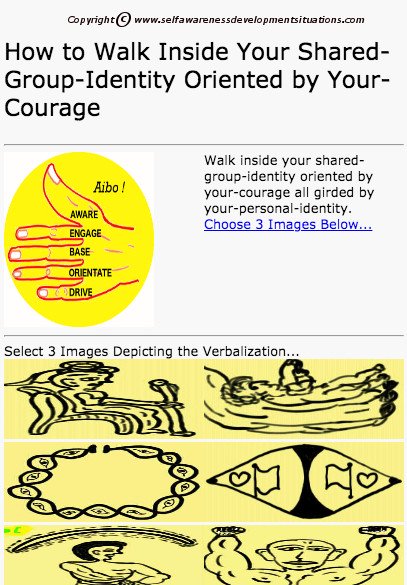 Select 3 Images ...Have you chosen a drawing that best represents Your-Shared-Identity and then pondered upon this image. This is an incremental creative process or mental gym in which you grow from one session to the next. Now, check that you have followed similar steps to do Your-Courage and similar steps to do your-personal-identity Lastly, Select an image that Best Represents...your combination of these 3 personal qualities.. Ask yourself the following question. Which personal quality from the 3 is most projected at you right now? Say for example, your-personal-identity. Then zoom in there, through something like: 1) "You are "Aware" of your-shared-identity as your pillar in your group?" 2) "You "Engage" or consult with your-shared-identity as your driver?" 3) "You collaborate with (and base or align your decisions to) your-shared-identity?" 4) "Your-Courage is always orientating your walk with your-shared-identity?". 5) Finally, " your-personal-identity covers (girdles) Your-Shared-Identity together with Your-Courage when you find yourself inside your personally challenging situations?" Do you see the new role of your-personal-identity in this verbalisation as compared with the verbalisation in the previous newsletter "How To Walk With Your-Personal-Identity"? (Click #075 to review the article.) Then, Verbalise Your-Group-AwarenessMake Real-time Consciousness of Your Group-Identity-Awareness In Situations Your Awareness Priority!