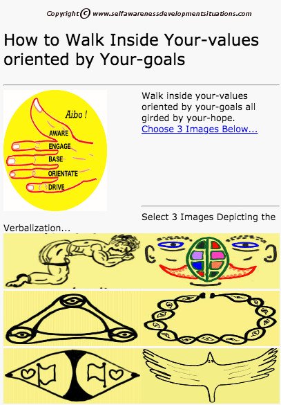 Select 3 Images ...Have you chosen a drawing that best represents your-values and then pondered upon this image. This is an incremental creative process or mental gym in which you grow from one session to the next. Now, check that you have followed similar steps to do your-goals and similar steps to do your-hope Lastly, Select an image that Best Represents...your combination of these 3 personal qualities.. Ask yourself the following question. Which personal quality from the 3 is most projected at you right now? Say for example, your-values . Then zoom in there, through something like: 1) "You are "Aware" of your-values as being pure, true, just and ultimately good?" 2) "You "Engage" or consult with your-values as your base?" 3) "You collaborate with (and base or align your decisions on) your-values?" 4) "Your-values in turn house You (the self of you) when walking towards your-goals ". 5) Finally, " your-hope covers (girdles) your-values together with your-goals when you find yourself inside your personally challenging situations?" Then, Verbalise Your-IdentityMotivesControl-AwarenessMake Real-time Consciousness of Your-IdentityMotivesControl-Awareness In Situations Your Awareness Priority!