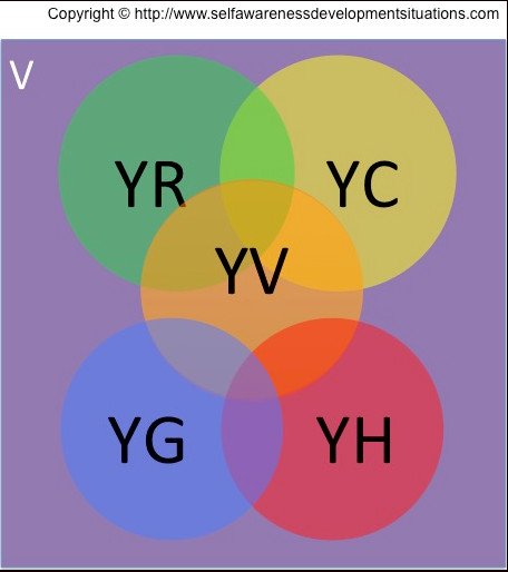 These atmospheres share one personal quality, your-values. Using your-values as the connector, have a look at the intersection, carefully, on the interconnected venn diagrams. Your-increasing-awareness is reflected in the dimensions you can flow through. For example, just to show you Five dimensions: 1) YR, YV, YC 2) YG, YV, YH 3) YR, YV, YH 4) YC, YV, YG 5) YR, YC, YV, YG, YH Notice that YV is always part of any of your flows. Now, Imagine How Beneficial This Awareness (In Real-Time) is For You In a Tense SituationVerbalize Your-Increasing-Awareness With Something Like...