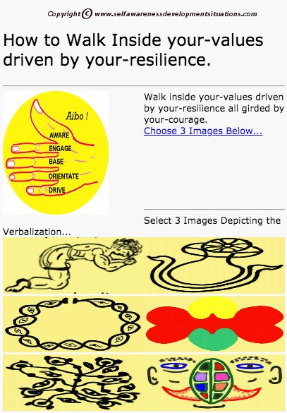 Select 3 Images ...Choose a drawing that best represents your-values and then ponder upon this image. Feel free to draw your own images that represent your-values. Now, select another image that represents your-resilience (see Move From Self-Resilience to Your-Resilience for more information. Lastly, Select an image that Best Represents...Your-Courage . Ask yourself the following questions: 1) "Are you "Aware" of the potency of your courage?" 2) "Are you "Engaged" with this courage?" 3) "Do you live inside (are you based in) your courage?" 4) "Are you always oriented by your courage?" in situations. 5) Finally, "Are you driven by your courage" in ALL situation?" Then, Verbalise Your-Values-AwarenessMake Real-time Consciousness of Your-Values In Situations Your Awareness Priority!